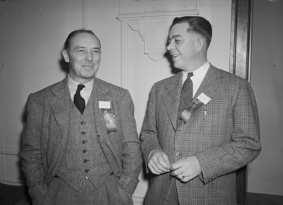 West Central Texas Oil and Gas Association convention met in Abilele. Convention attendees and Association directors are (left to right) Allen Guiberson, Dallas, Texas, and V. C. (Bud) Perini Junior of Abilene, Texas . Both men are wearing suits and ties as well as badges that say "director" on them. They are standing and engaged in conversation. Published in the Fort Worth Star-Telegram evening edition, December 3, 1940.