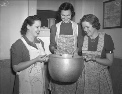 Left to right, Mildred Toliver, Verita Leshe and Oma Martin are pictured holding a large pot between them. The women are all wearing aprons and are standing in the corner of a room, smiling and looking down on the pot.