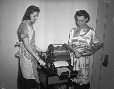 Lois Buckman is shown operating a mimeograph machine from the side. Miss Olive Weaver stands on the other side of the machine holding a stack of papers and observing the machine. The women are wearing aprons and standing in the corner of the room with a door behind Miss Weaver.