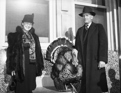 Lieutenant Colonel and Mrs. O. B. Abbott are shown with their pet turkey, "Oscar," in front of the Worth Hotel. Mrs. Abbott is wearing a hat, dress, brooch, paisley scarf, and a fur coat. Colonel Abbott is dressed in a hat, double breasted suit and a long coat.