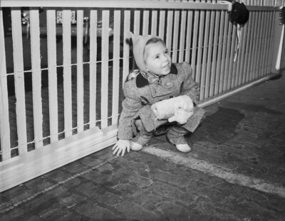 The Elks Club-Salvation Army is participating in the "Mile of Dimes" movement to provide apparel for needy boys and girls. Jo-Sheria Briscoe is adding her dime to the log line of donations. She is bundled-up in a elfin cap, coat, leggings, and a muff to keep her hands warm. She is the four-year-old daughter of Mr. And Mrs. J. C. Briscoe. An automobile is parked on the other side of the fence.