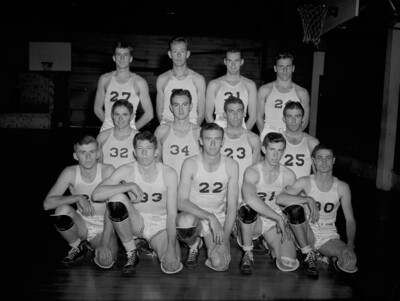 The 1940-1941 Texas Christian University (T. C. U.) basketball squad. Left to right, on the front row, are Al Wagler, Floppy Blackmon (no. 33), Leonard Cannady (no. 22), Buddy Barron (no. 21) and Guy Holt (30). On the second row are Billy Blackstone (no. 32), Jimmie Pattee (no. 34), Dennis Tankersley (no. 23) and Ralph Tankersley (no. 25). On the back row are L. A. Monroe (no. 27), Jack Billingsley, Robert Groseclose (no. 31) and Marcel Harrison (no. 24).