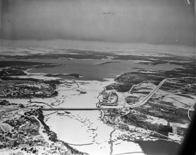 Air view at Lake Worth showing Casino Beach and Ballroom in snow and ice, center right above bridge, 01/22/1940
