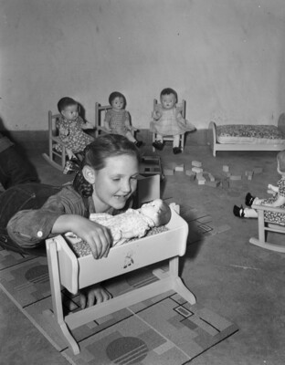 Forestine Tidwell rushed over to Sylvania Park after school to be the first child to take out a toy from the new Toy Loan Center. She is shown lying on the floor, rocking a doll in a crib. She is wearing a button-up blouse and jeans. The group of dolls she chose from are arranged in the play room.