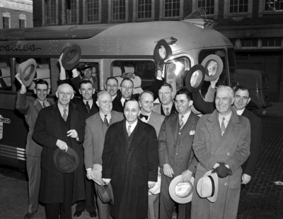 Representatives of Tarrant County Masonic Lodge left early in a chartered bus for Waco to be present when Sam B. Cantey Jr., of Fort Worth is installed as grand master of the Masonic Grand Lodge of Texas. Nine lodges are represented in the group. Left to right, they are: Wells Howard, John Estill, E. J. Glover, R. George Hill, C. J. Hendricks, Dudley Johnson, J. J. Langlois, Sam G. Lee, Harry Olmstead, John W. Gray, Lon Stephenson and Charles Simmons. The driver is Oliver N. Young, who is also a mason. Published in Fort Worth Star-Telegram December 5, 1940.
