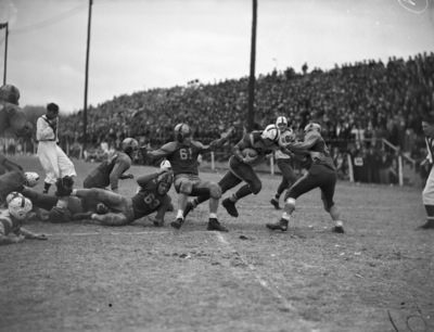 The Stephenville High School football team is playing on the road against Temple High School in the bi-district tournament. Jolting aside all opposition is Temple's rugged Fullback, Ed Dusek. He is charging forward for the four yard touchdown in the third quarter. Stephenville's star tailback and defensive man Barney Welch, 61, is pursuing from behind. Temple edged out the strong Stephenville team and will move on to meet Longview High School.