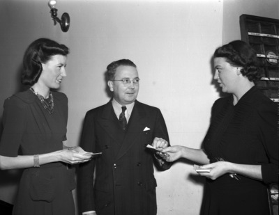 Knickerbocker Lecture Tickets Go Fast: H. R. Knickerbocker lecture will be held at First Baptist Church auditorium on Thursday at 8 pm. Proceeds will go to Goodfellows Fund and the Santa Pals. Tickets sold quickly with the help of the Optimist/Optimisses Club. In this photograph Mrs. Roxie Turnage (left), assistant secretary of the Optimists is observing Mrs. Tom Q. William’s (right) technique in selling G. N. Hailey (gentleman standing in the middle) a handful of tickets. Mrs. William is chairman of ticket sales in the Optimisses Club for the Celebrity Series. Published in Fort Worth Star-Telegram evening edition, December 11, 1940.
