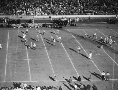 The Masonic Home football team is on the road, facing the Sunset High School in Dallas, Texas. The Masons were down late in the game when they began this drive. Mason's Quarterback C. D. Sealey is shown dropping back in the pocket near the twenty-five yard line. He is throwing a pass to the tall, athletic end Ray Coulter, 4. Clyde Roberts, 24 Masons wingback, is standing near the sideline of the forty pointing to the open receiver. The thirteen yard completion put the Masons near midfield. They followed the pass play with thirteen consecutive ground plays before earning a touchdown. The game ended in a 7-7 tie.