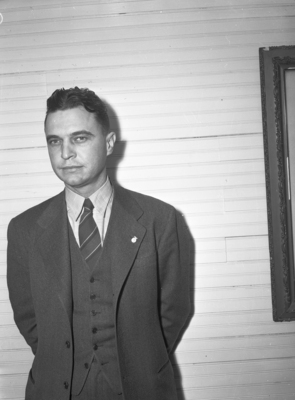 After winning his first bid to the Texas Legislature, Gene Worley is awaiting the day he is sworn in as a congressman. Mr. Worley grew up in Shamrock, Texas, in the Panhandle and is a big fan of football. His mother, Mrs. Fred Oliver, directed his campaign. Mr. Worley is standing against a wall with his hands behind his back. He is dressed in a three-piece suit with a pin on the lapel.