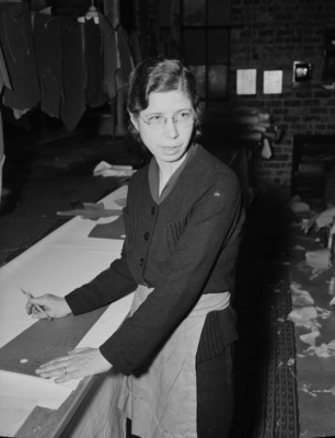 Mrs. Warren Hunter, Red Cross worker, shown at work. She is working before and after hours and during her lunch time cutting garments to be sewn for victims of the European conflict. Published on December 12, 1940.