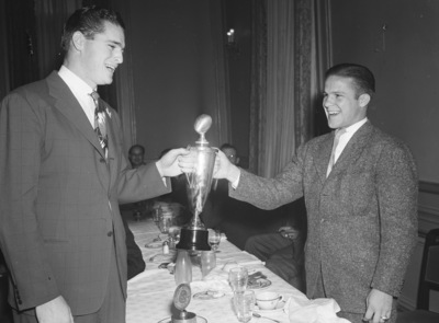 Texas Christian University (TCU) football Pollywog Dean Bagley of San Saba, Texas presents the Exchange Club's trophy to John Bond, big halfback from McLean, Texas.