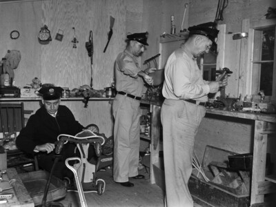 A group of Riverside firemen are playing assistant elves to Santa Claus at the Riverside Lions Club. The elves are, left to right, H. W. Franklin, G. H. Buckland, and C. H. Hackney. The firemen are overhauling hundreds of toys the organization has collected to distribute to underprivileged children for Christmas. Mr. Franklin is wearing a peaked cap, collared shirt, jacket, and trousers. He is fixing a wagon wheel. Mr. Buckland is dressed in a peaked cap, button-up shirt, and trousers. He is adjusting a buggy. Mr. Hackney is wearing a peaked cap, button-up shirt, and trousers.