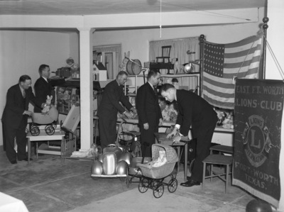 Some East Side Lions examine a portion of the rehabilitated toys which their club, elementary school children and firemen at Station No. 14 have collected and repaired for Christmas presents for underprivileged Fort Worth children. The toys are being distributed through the Parent-Teacher Associations of elementary schools. Left to right, H. G. Hoffman, president of the club; John C. Robertson, chairman of the toy drive; Joe P. Moore, toy committeeman; Roscoe Gass, publicity chairman, and Reverend E. D. Dunlap, club member and pastor of the Polytechnic Baptist Church, the distribution center for the toys. They are checking over the toys to be distributed at Christmas time. Beside the group, a banner for the club is hanging. Published in the Fort Worth Star-Telegram evening, edition, December 13, 1940.