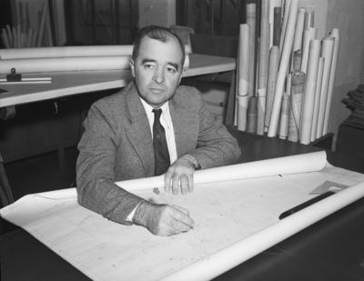 George A. Weaver is a geologist with the Pure Oil Company. He was recently transferred to the Fort Worth, Texas, office from Roswell, New Mexico. Mr. Weaver has been with the Pure Company for 15 years. He is shown sitting at his desk, studying a map. He is dressed in a suit.