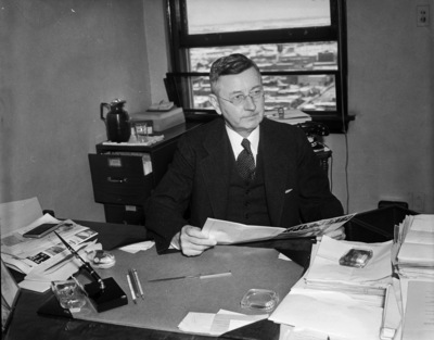 Means of carrying out the 1940 Chamber of Commerce "Forward Fort Worth" program occupied the attention of B. B. Stone, the organization's new president. Stone is an attorney. He was elected to the post at a luncheon meeting of directors. In this picture, he is sitting at a desk and holding a periodical. On the desk are several documents, pencils, a pen and a knife. Behind him, at right, atop a table, is a telephone and a gavel. Behind him, at left, atop a filing cabinet, is a pitcher and a glass. Published in Fort Worth Star-Telegram, morning edition, January 23, 1940.