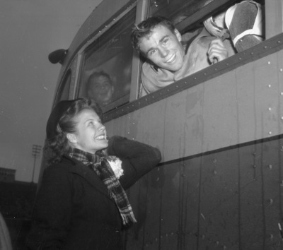 Masonic Home football player Gordy Brown looking out of bus window with pretty girl