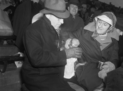 The Masonic Home Football team has a good group of young and veteran players, leading them to a District Seven Division title. But the Masons are hoping to continue their hot streak in the playoffs in the quarter-finals game against the Paris Wildcats. Bundled in the stands, watching the game are Mr. and Mrs. Leonard Lamb. Mr. Lamb is wearing a hat, coat, scarf, and gloves. Mrs. Lamb is pouring coffee from a steaming thermos. She is wearing two layers of coats, a hat, gloves, and a scarf tied around her head. After a hard fought, cold game, the Masons went on to win the 6-6 penetrations victory.