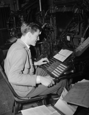 The football players at the Masonic Home and School study subjects other than gridiron strategy. They learn to make a living even if they never get a bid from the professional leagues. Curtis Robbins, who plays center for the Masons is shown operating a linotype machine. He will specialize at the linotype next-term. The seventeen year old senior shot up to 154 pounds, a heavy guy for the Masons, and made the starting lineup. Though Curtis will graduate with a trade, he hopes to attend college. He is wearing a collared shirt, sweater, and trousers.