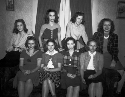 The new members of Sub-Deb Club are being honored at a luncheon at the Hotel Texas. They are, left to right, on the front row, Mary Kathryn Stokes, Sarah Jane Wilkins, Dorothy Johnson, Peggy Dyer, Betty Jo Bray, and Betty Zane Hitts. On the back row are Margaret June Sisk and Florian Felknor. Miss Stokes is sitting on the arm of the couch, dressed in a button-up blouse and a skirt. Miss Wilkins is wearing a sailor style dress. Miss Johnson is dressed in a collared shirt, sweater, and a plaid skirt. Miss Dyer is wearing a plaid button-up blouse and a skirt. Miss Bray is dressed in a collared blouse, wool sweater, and a skirt. Miss Hitts is sitting on the opposite arm of the couch, dressed in a blouse, plaid blazer, and a skirt. Miss Sisk is wearing a button-up dress. Miss Felknor is dressed in a striped blouse and a skirt.