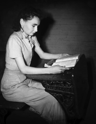 Irene Harris has been named Tarrant County's number one 4-H girl for 1940. Some of the traits that won her the honor was her schoolwork, household skills, sewing ability, and carpentry. Irene is a senior and honor student at Haslet High School and especially enjoys studying history. Some of her hobbies include making candles, sewing curtains, and redecorating old rocking chairs. She also finds the time to design and make her own dresses. Irene is pictured at her desk during history class, reading from the textbook. She is dressed in a collared blouse, sweater, and trousers.