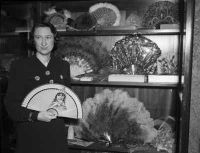Miss Florence Cobden has been pursuing her hobby of collecting fans for 13 years. She is pictured with some of her 114 fans, which are exhibited in a seven-foot antique cabinet. She is displaying one of the uniquely designed fans, depicting a woman's face. Miss Cobden is wearing a button-up blouse and a skirt.