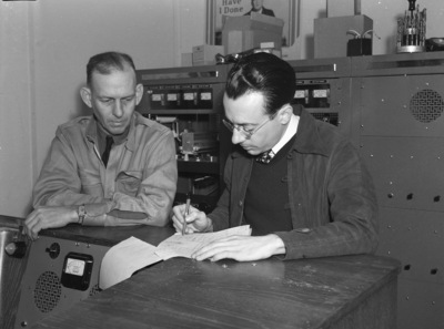 The Texas State Highway Patrol has a new radio truck. The 11,000 pound vehicle was designed by Sergeant R. G. Wilkins, left, the communications chief. On the right is J. E. Palmer. Sergeant Wilkins is in Fort Worth, Texas, to help Tarrant County install the accompanying equipment. He is dressed in a button-up shirt, necktie, and a jacket. Mr. Palmer is the head of the municipal radio service. He designed and built this transmitter. He is wearing a suit with a sweater.
