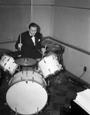Modern counterpart of what Old King Cole called for is shown here. The Musical Varieties Orchestra will sponsor the Worth Theater-Star-Telegram Goodfellows benefit show at midnight Friday. Cody Sandifer, drummer boy of the 45-piece musical organization is pictured here. A young boy seated playing drums, facing front and smiling. Published in The Fort Worth Star-Telegram evening edition, December 19, 1940