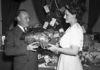 Mrs. C. B. Spence, wife of the president of the Advertising Club, receiving a sleigh filled with fruit from George Cranston, at Hotel Texas. It was the first gift presented by George Cranston, who acted as Santa Claus, at the annual Christmas frolic of the Club. Presents were contributed by members of the club and by merchants. Mrs. Spence is wearing a dress and she is wearing a bracelet on her left wrist. Mr Cranston is wearing a suit and eyeglasses. There is a Christmas tree and gifts in the background. Published in the Fort Worth Star-Telegram morning edition, December 19, 1940.