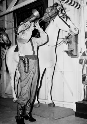 Amon Carter blowing an old trombone.