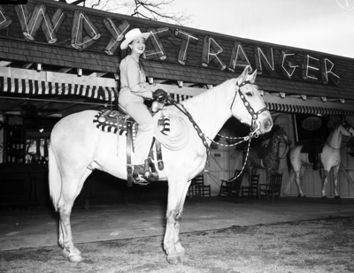 Mrs. John Carl Kriendler (the former Baroness Luisa Dumont de Chassart) on horseback at Shady Oak Farm. Newlyweds John Carl Kriendler ("Jack" of Jack & Charlie's 21 Club in New York City) and the former Baroness Luisa Dumont de Chassart were guests of Amon Carter in Fort Worth. This photograph is from their visit to Shady Oak Farm.
