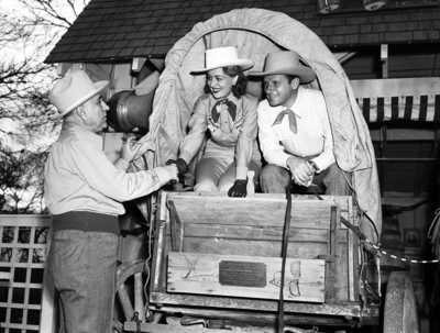 John Carl Kriendler (right) and Mrs. John Carl Kriendler (the former Baroness Luisa Dumont de Chassart, center) in a covered wagon at Shady Oak Farm. Luisa Kriendler is shaking hands with Amon Carter, Sr. John Carl Kriendler is wearing a cowboy hat and western style shirt and tie. Luisa Kriendler is wearing a cowboy hat, gloves, and a western style shirt and tie. Newlyweds John Carl Kriendler ("Jack" of Jack & Charlie's 21 Club in New York City) and the former Baroness Luisa Dumont de Chassart were guests of Amon Carter in Fort Worth. This photograph is from their visit to Shady Oak Farm.