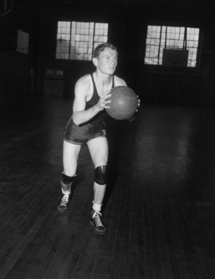 Gordon Brown is a basketball player at Polytechnic High School. He is a mainspring of the smooth Poly quintet. Brown, number 31, plays guard for the Parrots. He is shown on the court, dressed in his uniform. He is practicing shooting.
