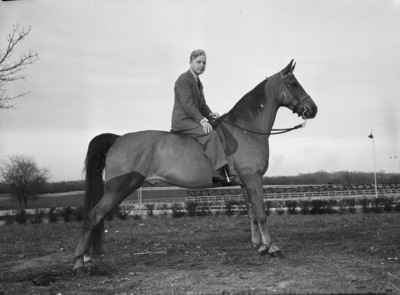 Fort Worth, Texas, has become the new home of the famous horse, "Fit For a King," The Tennessee walking horse is one of the most outstanding in the nation. Dr. Hugh Beaton, shown in the saddle, purchased the horse from Paul Whiteman. King is a six-year-old chestnut gelding. He won the Madison Square Garden Horse Show last year and repeated this year. Dr. Beaton is riding his horse, dressed in a suit. Either he or his daughter, Olive, ride the show animal daily in Rockwood Park. Fit for a King will be shown by Dr. Beaton at the Southwestern Exposition and Fat Stock Show in March.
