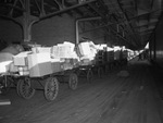 Gee, the Christmas mail and packages will burden Santa's Sleigh this year. A sample of the daily picture at the Texas & Pacific Railroad terminal here--where Christmas business is the heaviest in years. Lines of package-laden trucks are moved in and out of the terminal every few minutes. Fort Worth is Texas' main mail distribution point and mail handling agencies report business far ahead of last year. The Railway Mail Service estimates 25 percent heavier volume than ever before and Railway Express Agency says its business is up 14 percent over last December, which was the best in years. A long line of carts are shown filled with packages inside a large building. Published in the Fort Worth Star-Telegram Morning Edition December 23 1940.
