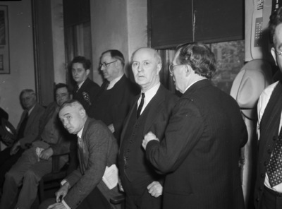 A legislative forum is being held at the Commissioners Courtroom. Officials are clashing over office duties and other governmental operations. Attending the forum, pictured at the right, are Judge Bruce Young and Clarence E. Farmer. Judge Young made statements about juvenile and lunacy court operations. He is dressed in a three-piece suit. Mr. Farmer is a former legislator. He is wearing a striped suit.