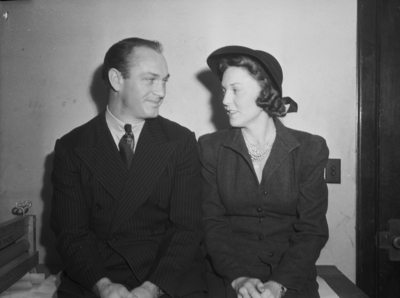 Coach Scott McCall and his bride, the former Dessie Katherine Lewis, are in Fort Worth, Texas, on their honeymoon. Coach McCall is a former letter-man at Texas Christian University and the Masonic Home. He is currently the line coach of the Shamrock Irish football team. He is dressed in a double breasted pinstripe suit. Mrs. McCall is a native of Shamrock, Texas, and the daughter of Mr. and Mrs. Matt Lewis. Mrs. McCall is wearing a hat, blazer, and a necklace.