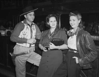 Cowboys and cowgirls are gathering at the Pioneer Palace for the J. E. Fender Barn Dance. They are participating in old-fashioned dances like "Little Brown Jug" as well as more modern ones. Pictured at the refreshments table, left to right, are Mr. and Mrs. George K. Taggert Junior and Miss Mary Lane Morris. Mr. Taggert is dressed in a cowboy hat, collared shirt, fringe vest, trousers, and has a holster on his hip. Mrs. Taggert is wearing a button-up dress with a necklace and is carrying a handbag. Miss Morris is dressed in a button-up shirt, bandanna, leather coat, and trousers.