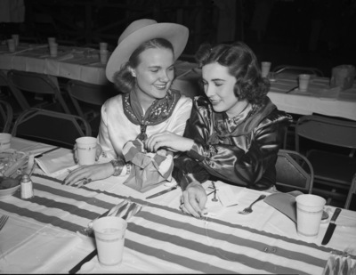 Cowboys and cowgirls are gathering at the Pioneer Palace for the J. E. Fender Barn Dance. They are participating in old-fashioned dances like "Little Brown Jug" as well as more modern ones. Attending the dance. left to right. are Mary Lake and Mary Belle Chilton. They are discussing holiday affairs over a bag of peanuts. Miss Lake is wearing a cowboy hat, bandanna, and a long-sleeve blouse. Miss Chilton is dressed in a silk blouse and a bandanna.