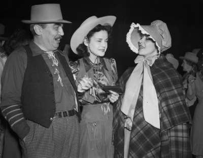 Cowboys and cowgirls are gathering at the Pioneer Palace for the J. E. Fender Barn Dance. They are participating in old-fashioned dances like "Little Brown Jug" as well as more modern ones. In attendance, left to right, are Mr. Hubert Hammond Crane, Mary Stone, and Mrs. Hubert Hammond Crane. Mr. Crane and Miss Stone are listening while Mrs. Crane "lays down the law" for correct behavior at the dance. Mr. Crane is wearing a hat, collared shirt, vest, and checkered trousers. Miss Stone is dressed in a cowboy hat, silk blouse, vest, and a skirt. Mrs. Crane is wearing a bonnet and a plaid shawl.