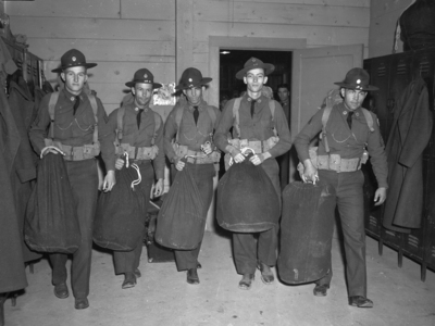 Fort Worth soldiers of the One Hundred Eleventh Medical Regiment leaving for Camp Bowie at Brownwood, Texas are (left to right) Sergeant D. Stockton, Private R. C. Johnson, Sergeant W. E. Matthews, Private W. J. Harding and Sergeant W. C. Groom. After a long wait, these five men of Company D, the ambulance company, are leaving for Camp Bowie, eager for a year's active training. The men are in uniform carrying equipment and duffle bags out of the barracks. Published in the Fort Worth Star-Telegram morning edition, December 28, 1940.