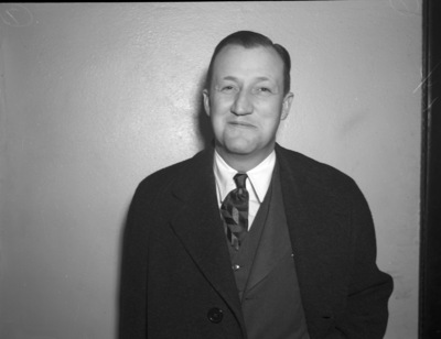 The top 25 best salesmen in Fort Worth, Texas, are being honored at the 18th annual Salesmen's Banquet at the Hotel Texas. Attending the banquet is John D. Moore, of Belleville, Illinois. He has been an employee of the Zone Company since June of 1940. He is standing against a wall, dressed in a three-piece suit and a coat.