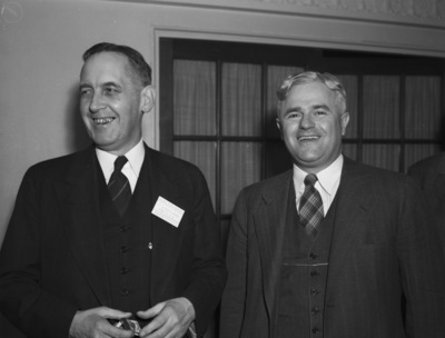 The Sigma Alpha Epsilon Fraternity in holding their 85th annual convention at the Hotel Texas in Fort Worth, Texas. In attendance, left to right, are T. Gibson Hobbs and Professor John O. Moseley. Mr. Hobbs, of Lynchburg, Virginia, is an attorney. He graduated from the University of Virginia in 1909 and served as national president of the fraternity from 1922 to 1924. He is dressed in a three-piece suit with a name tag. Professor Moseley is the dean of students at the University of Tennessee. He founded the leadership training school of the fraternity, which he now directs. He also served as national president from 1935 to 1937. He is wearing a three-piece, pinstripe suit.