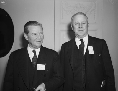 The Sigma Alpha Epsilon Fraternity in holding their 85th annual convention at the Hotel Texas in Fort Worth, Texas. In attendance, left to right, are Elmer B. Sanford and Marvin E. Holderness. Mr. Sanford is the counsel for a group of public utilities operating in New York City, New York. He serves as secretary of the fraternity. He graduated from the University of Michigan in 1899 and the University of Kansas in 1902. He is wearing a three-piece, double breasted suit. Mr. Holderness, is the vice president of the First National Bank in St. Louis, Missouri. He is a 1902 graduate of Vanderbilt University and served as archon from 1913-1914. He is dressed in a three-piece suit.