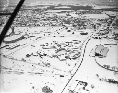 Air view showing Casa Manana and the Frontier Fiesta grounds, part of the Farrington stadium and a back side view of the Will Rogers Memorial Coliseum. The ground is covered in snow. Published in Fort Worth Star-Telegram.