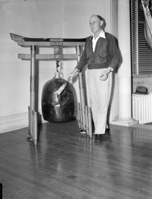 Interior of Winfield Scott Home (Thistle Hill), 1509 Pennsylvania Avenue; caretaker S.R. Whitlock stands next to Japanese gong purchased by Mr. Scott.