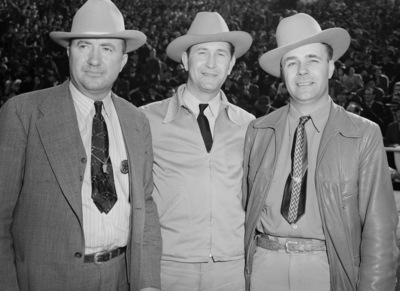 Texas A & M University versus Fordham University at the Cotton Bowl. Thousands came to the Cotton Bowl battle between the Texas Aggies and Fordham Rams. Here we have, left to right, Texas Ranger A. L. Barr, Houston, Texas; Deputy Sheriff Bill Parr, Tarrant County and Captain Gilbert of the State Highway Patrol, at Dallas, Texas. The three men are all wearing hats, jackets, and ties. In the background are spectators in the stands. Star-Telegram Morning January 2, 1941