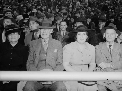 Texas A & M University versus Fordham University at the Cotton Bowl. Mr. and Mrs. H. E. Ritchey Fort Worth, Texas at left and Mr. and Mrs. Mal Brin of Dallas, Texas. It was a family reunion and football game for Mr. and Mrs. H. E. (Pop) Ritchey. They spent New Year's with their daughter and son-in-law, Mr. and Mrs. Mal Brin. Mr. Ritchey and Mr.Brin are wearing suits and and hats. Mrs. Ritchey and Mrs. Brin are wearing hats and dresses. The group is seated with many spectators behind them. Star-Telegram Morning January 2, 1941