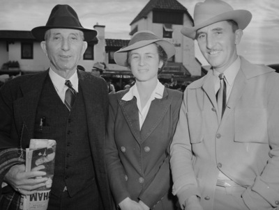 Texas A & M University versus Fordham University at the Cotton Bowl. Cotton Bowl spectators Abe Mayer, left, and his son and daughter in law, Mr. and Mrs. Joe Mayer, all of San Angelo, Texas. Abe is holding a newspaper in his right hand. All three are wearing hats. The two men are wearing suits. Mrs. Mayer is wearing a jacket. Star-Telegram Morning January 3, 1941.