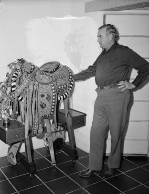 Mr. and Mrs. H. D. Cornell are building one of the most attractive and modern ranch homes in the Southwest. The Bar C Ranch will raise and train Palomino and Arabian horses. Located in the Davis Mountains, about ten miles from Kent, Texas, the ranch features a picturesque mountain backdrop. Mr. Cornell is standing inside his new home, admiring a saddle. The beautiful, hand stamped saddle was made in El Paso, Texas. Mr. Cornell is wearing a button-up shirt, trousers, and cowboy boots.