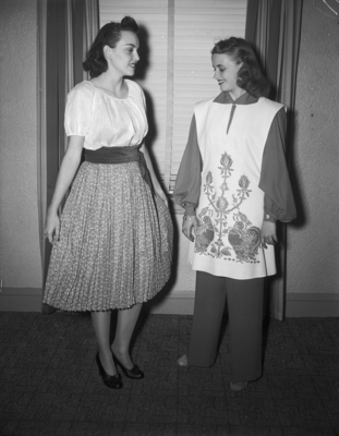 The National Fashion Exhibitors of America are holding their show at the Hotel Texas. Modeling styles left to right are Ruth Bursey and Elizabeth Ann McElyea. Miss Bursey is wearing a calico frock with the new Indian broomstick "wrinkle" skirt of green and yellow and a white batiste blouse. A red jersey scarf is tied around her waist. Miss McElyea is dressed in an elaborate patio cabana slack suit showing the Chinese influences. The fabric is hand-blocked "trade-wind". The blouse has Gaucho sleeves and the coat is sleeveless with a design down the front.